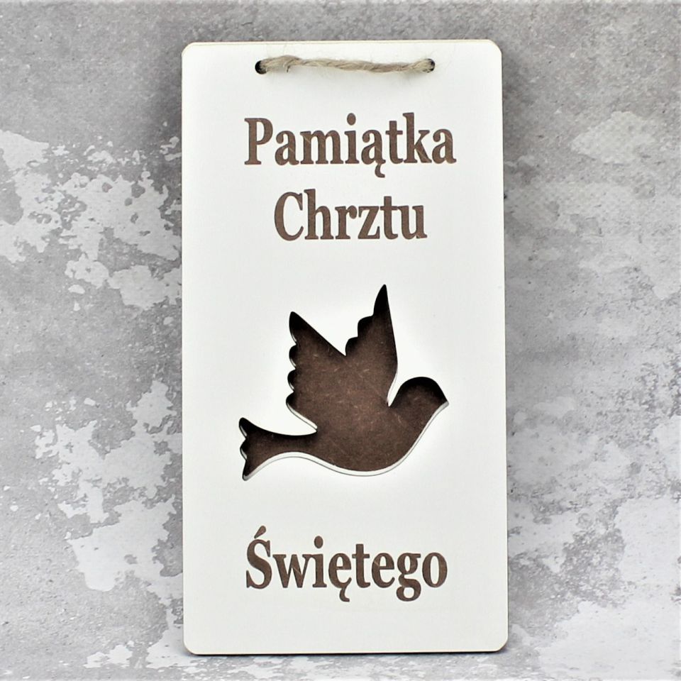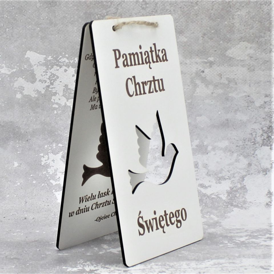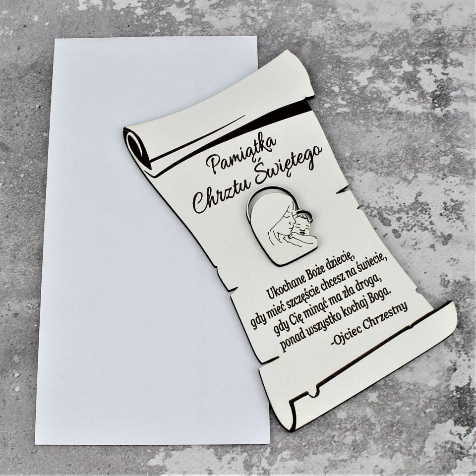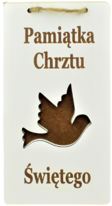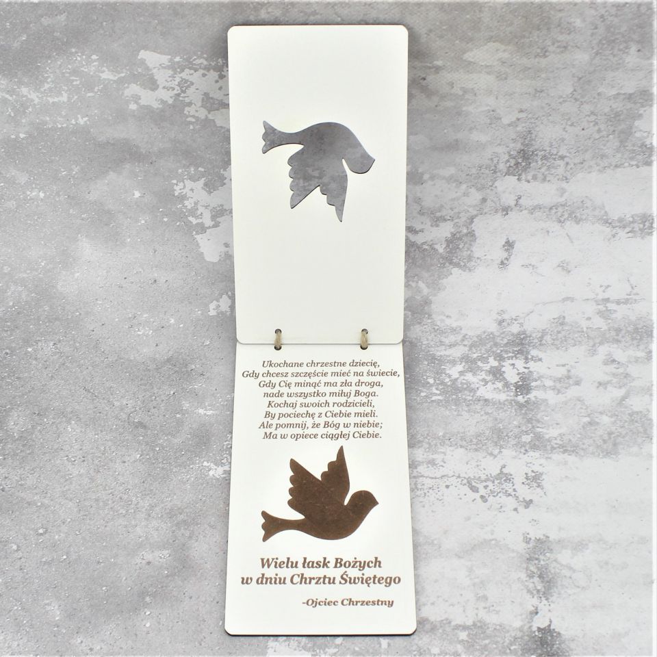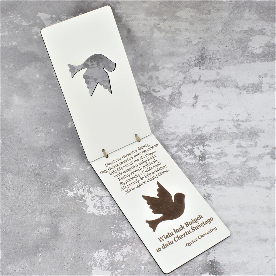 Nasza drewniana kartka będzie z pewnością piękną oraz oryginalną pamiątką dla dziecka od Ojca Chrzestnego z okazji Chrztu Świętego.