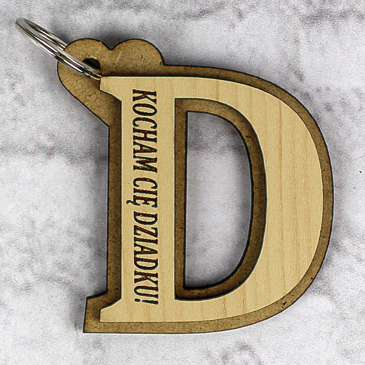 Breloczek z grawerem, w kształcie litery D, w kolorze brązowo-naturalnym