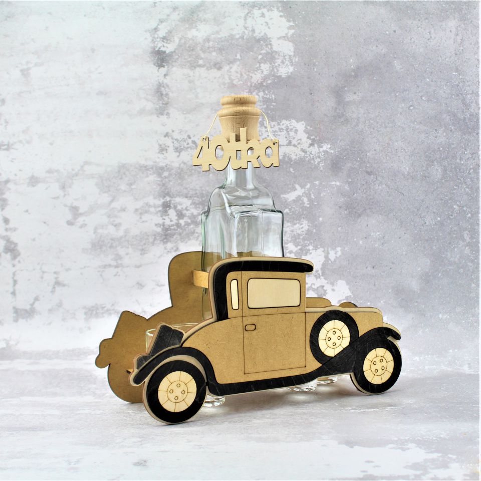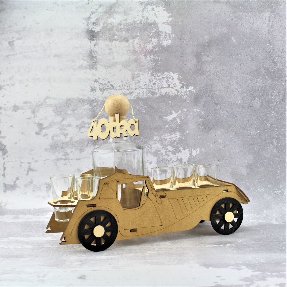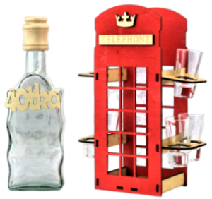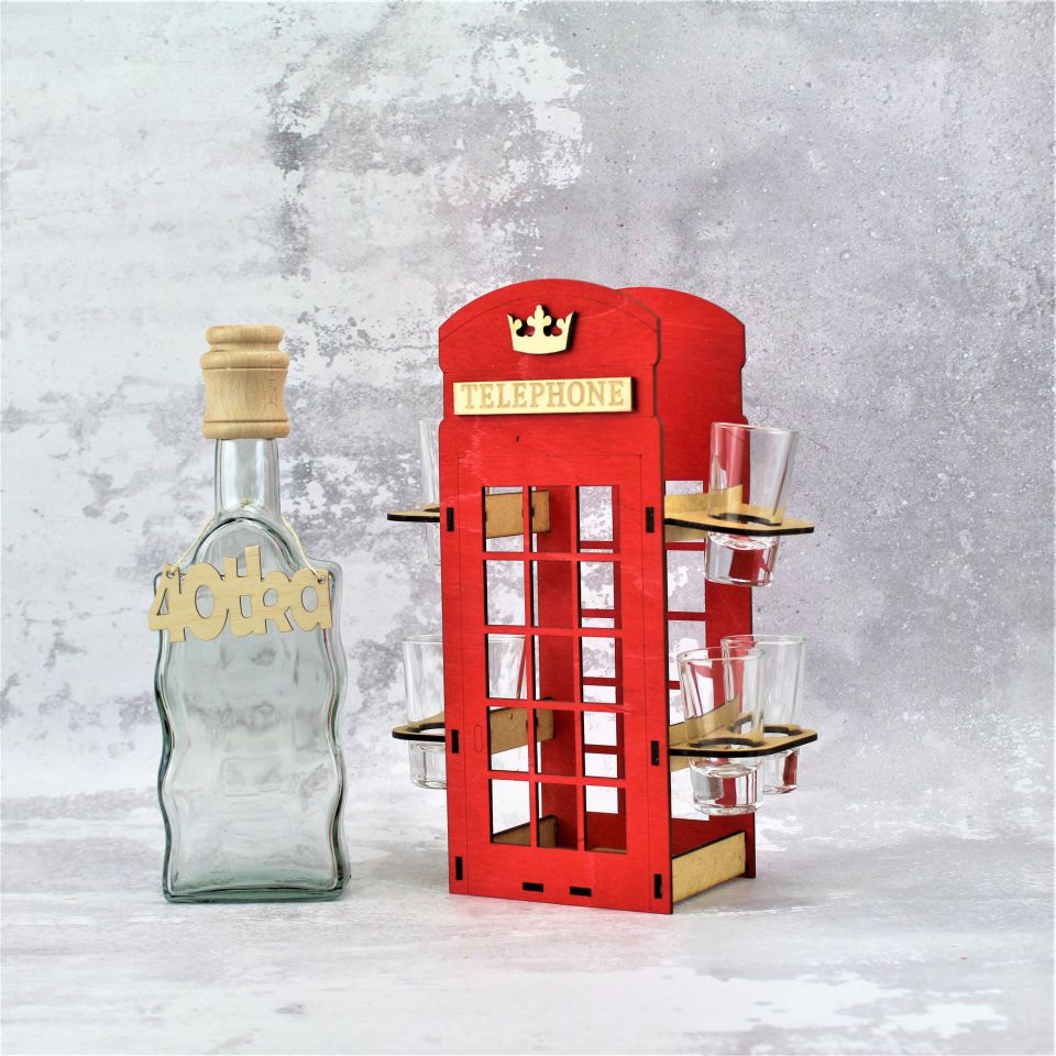 Proponujemy elegancki zestaw do wódki, likieru czy innego alkoholu. Karafka z kieliszkami umieszczona w podstawie w kształcie budki telefonicznej.