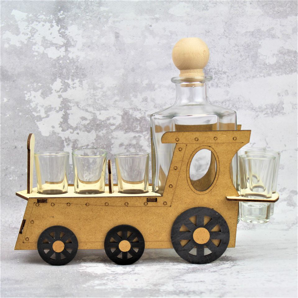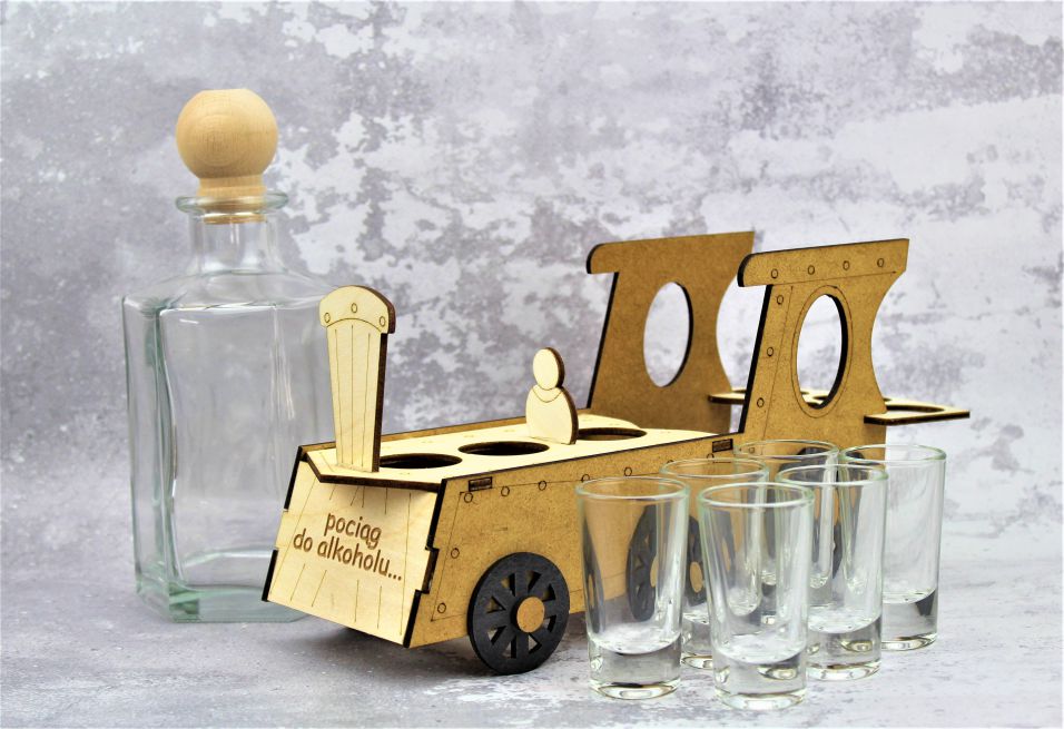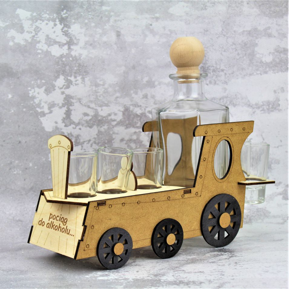 Karafka z kieliszkami umieszczona na podstawie w kształcie pociągu z grawerem, idealny prezent dla taty, brata, chłopaka, szwagra, kolegi czy znajomego.