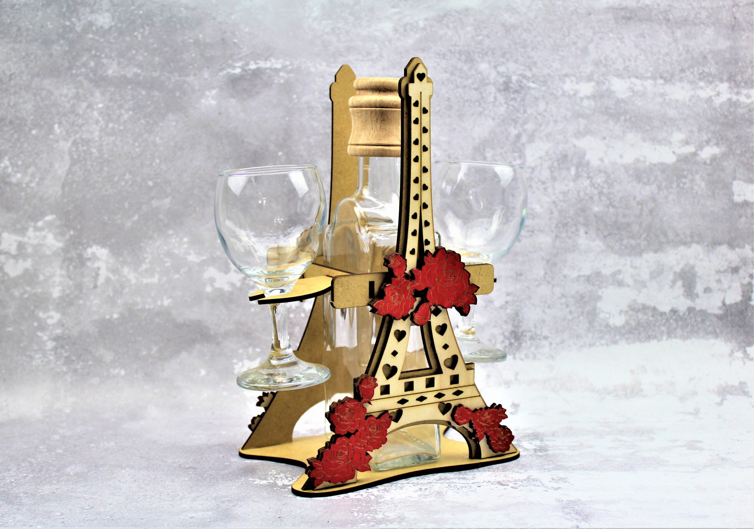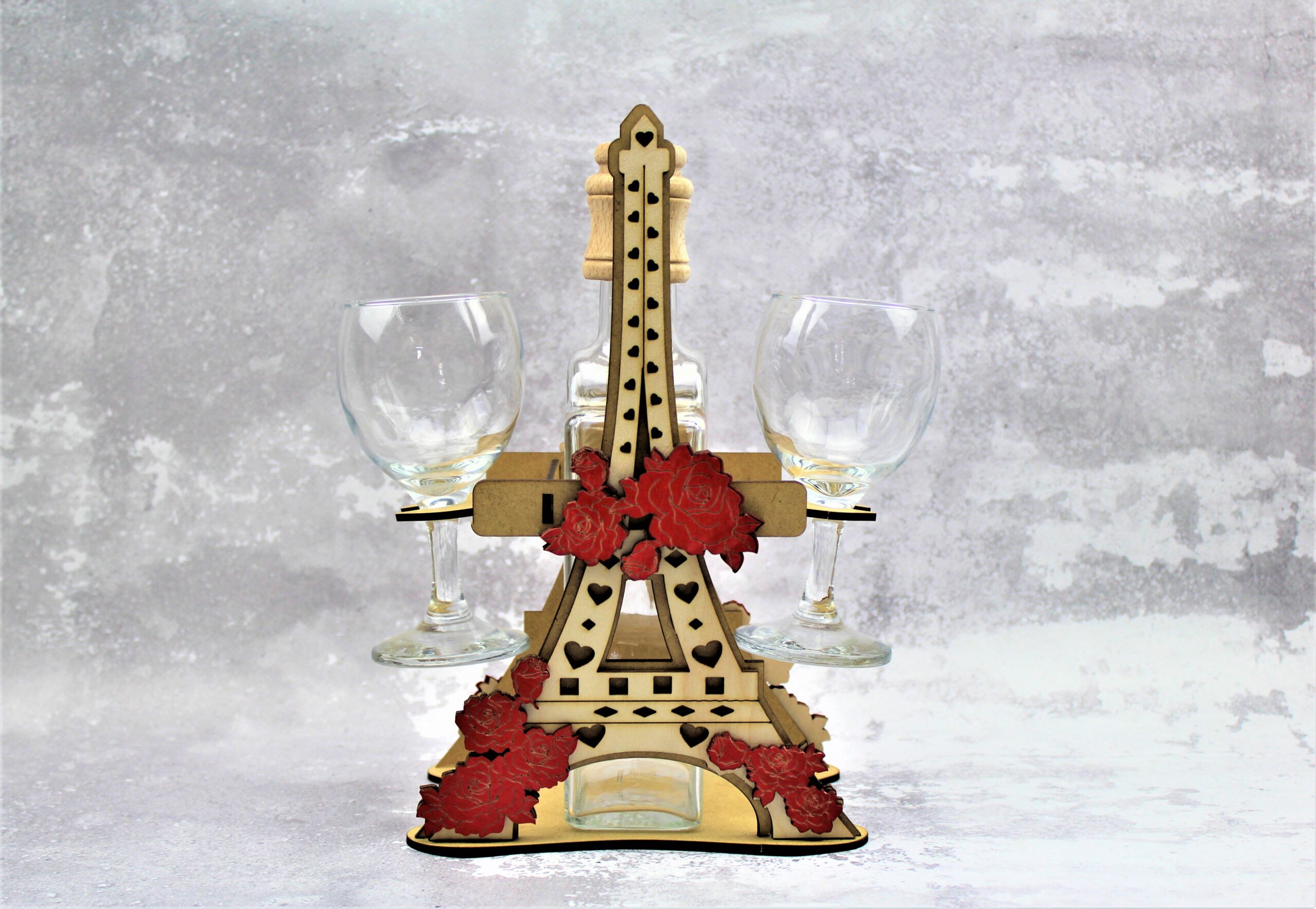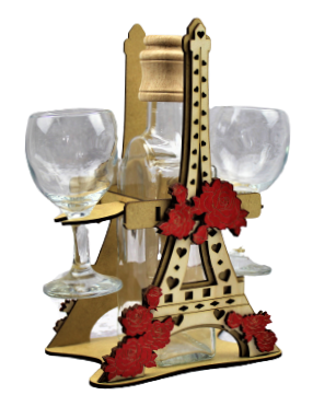 Karafka z kieliszkami umieszczona na podstawie w kształcie Wieży Eiffla.