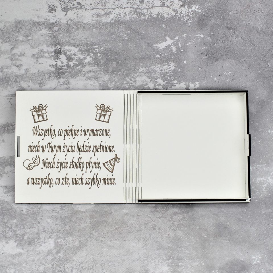 Istnieje możliwość wygrawerowania imienia solenizanta / solenizantki oraz daty – w wolnym miejscu obok życzeń.
