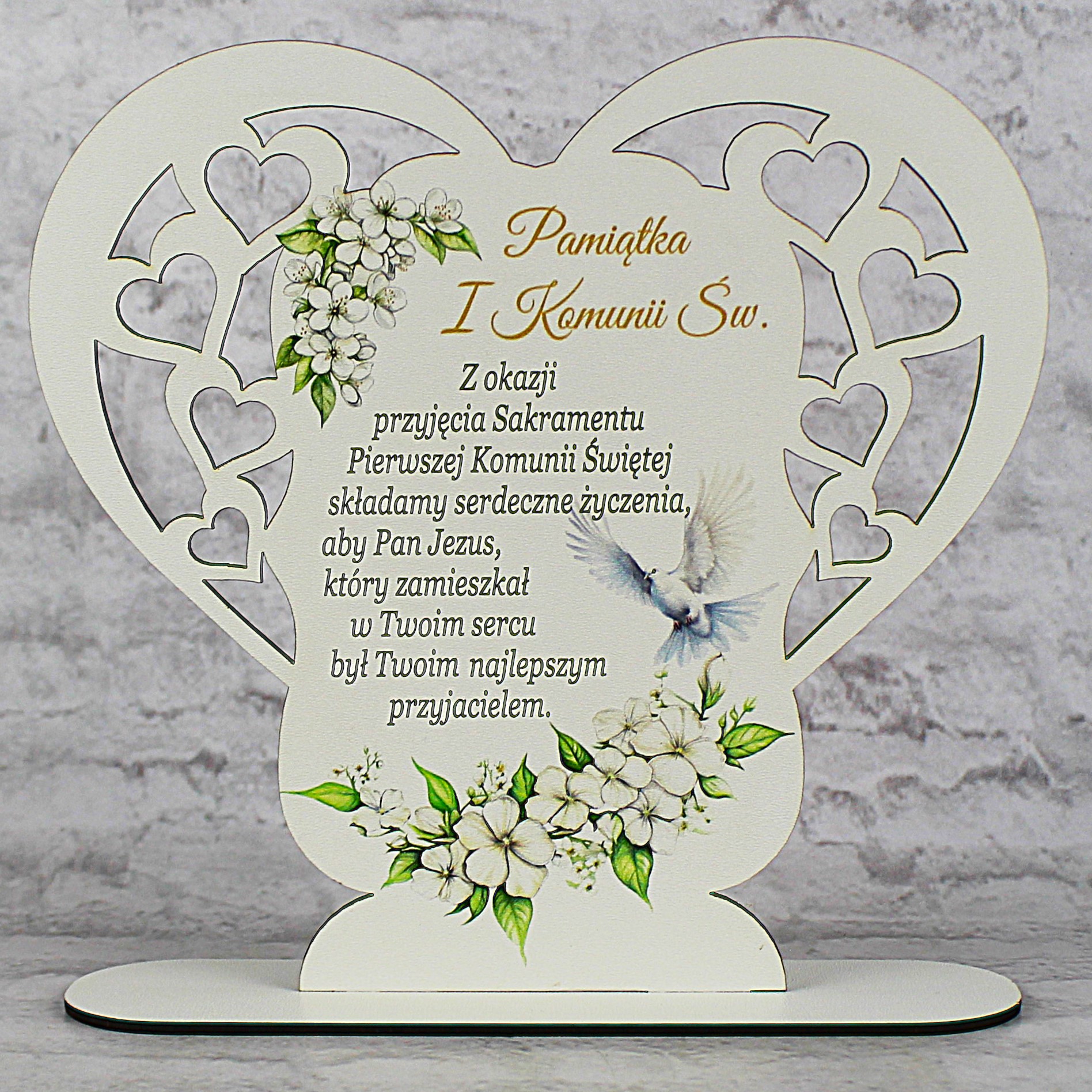 Komunia Święta to wyjątkowa uroczystość dla całej rodziny. To dzień przepełniony radością, szczęściem i dobrymi życzeniami. Każdy z gości przynosi również upominek dla dziecka. Prezent z okazji pierwszej Komunii Świętej powinien być wyjątkowy, dlatego proponujemy piękną pamiątkę – stojak serce ażurowe z pięknym kolorowym nadrukiem oraz życzeniami.