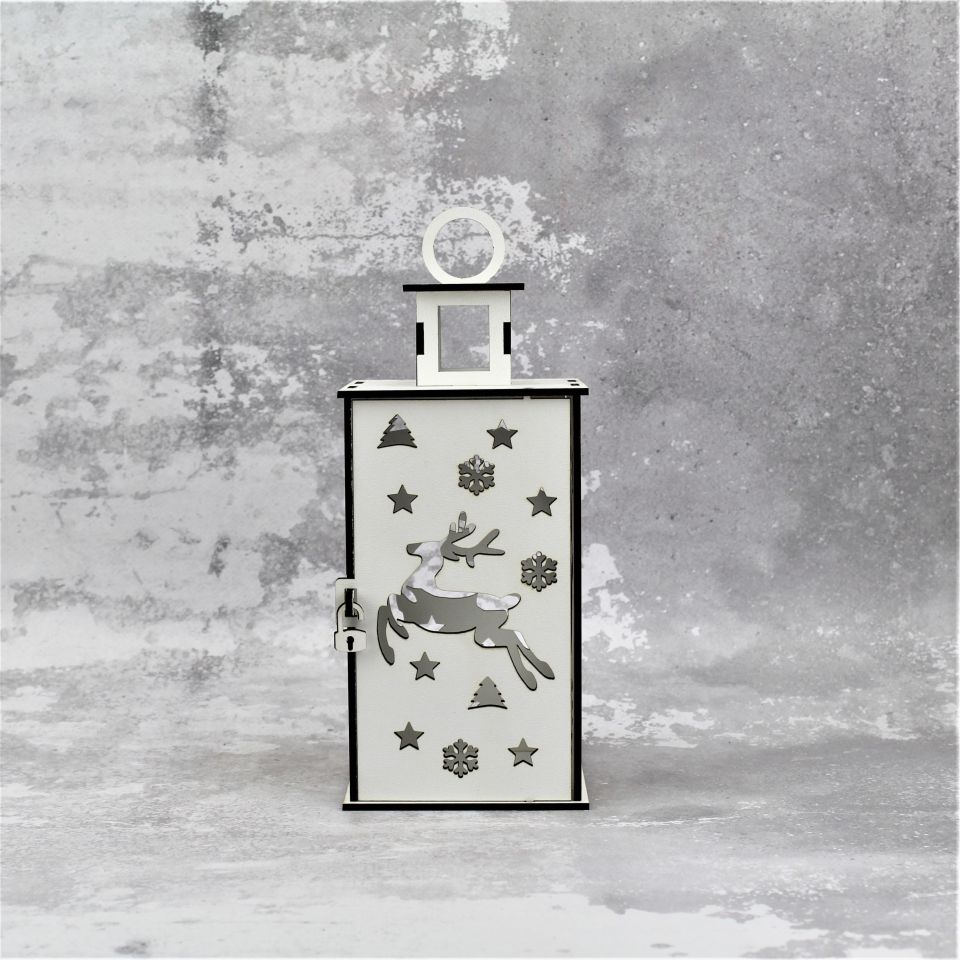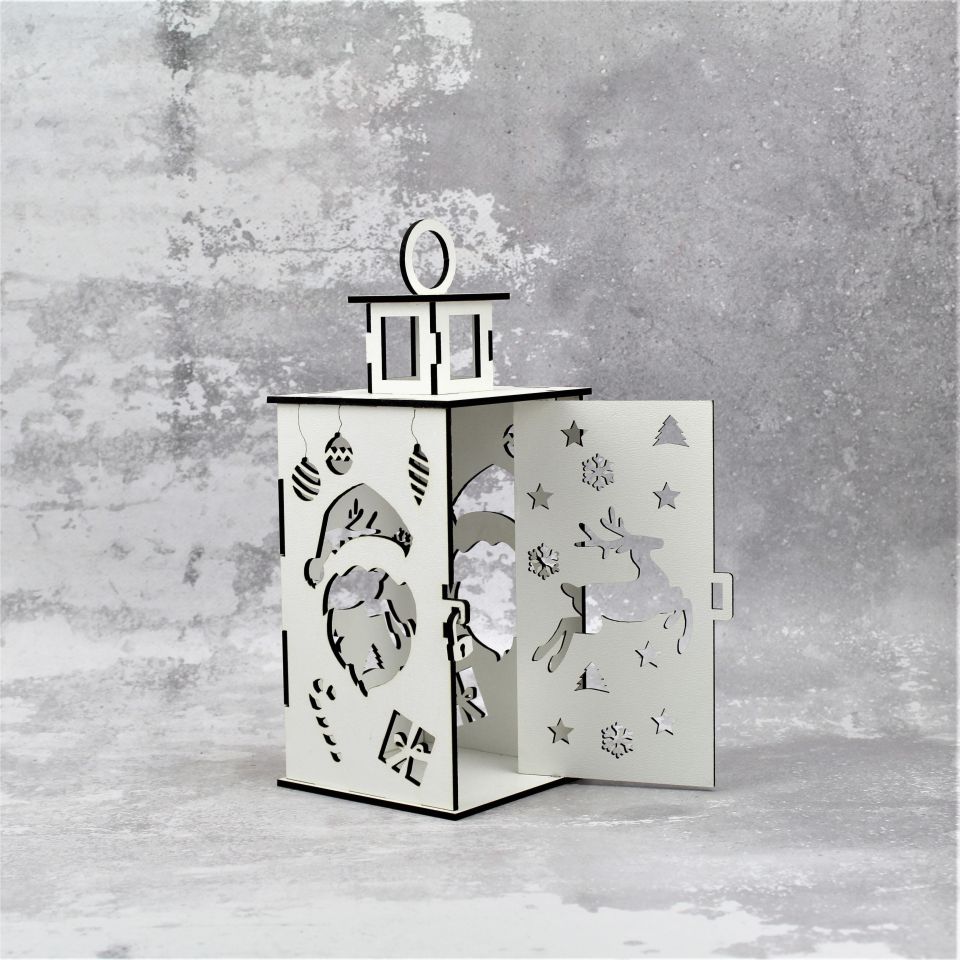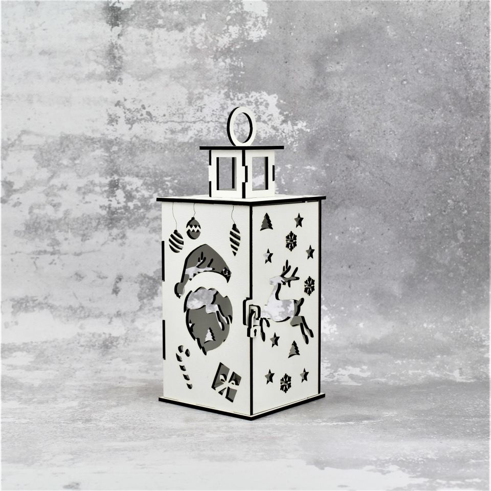 Lampion wykonany z białej płyty HDF, z dbałością o każdy szczegół, wycinany laserowo, o wymiarach 10 x 10 x 25 cm