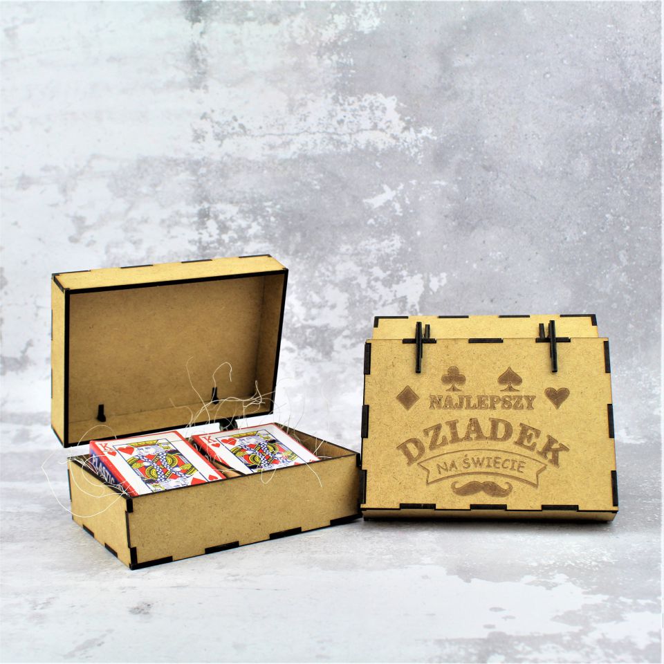Pudełko wykonane z dbałością o każdy szczegół z płyty HDF, wycinane laserowo z grawerem – Najlepszy Dziadek na świecie. Zawiera 2 talie kart – gotowy upominek dla ukochanego Dziadka na różne okazje: Dzień Dziadka, Urodziny, Imieniny. Zamiast kart w pudełeczku można oczywiście umieścić inne pamiątkowe drobiazgi, w zależności od upodobań Dziadka.