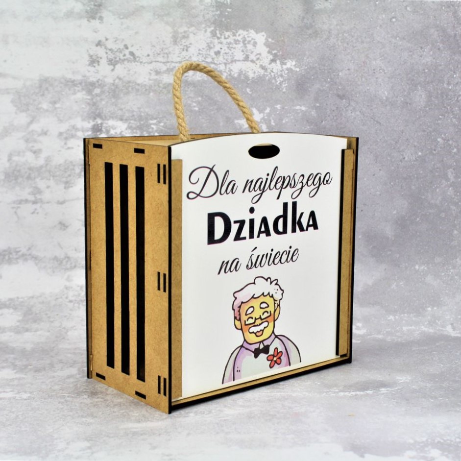 Polecamy piękną skrzynkę – pudełko na kubek i herbatę.  Wykonana z płyty HDF z dbałością o każdy szczegół, wycinana laserowo.  Skrzyneczka zamykana na zasuwkę, wykonaną z białej płyty, z kolorowym nadrukiem oraz tekstem Dla Najlepszego Dziadka na świecie.