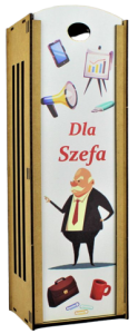 W zestawie ze skrzynką – folia prezentowa potrzebna do zapakowania prezentu , kolorowa rafia, oraz Szef – zawieszka na butelkę.
