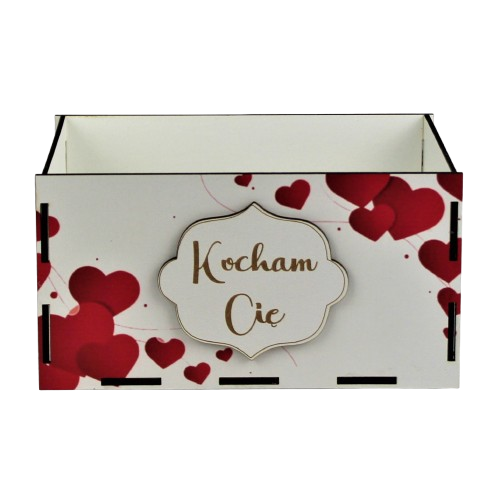 Pudełko zdobi piękna, walentynkowa grafika z eleganckim napisem KOCHAM CIĘ.