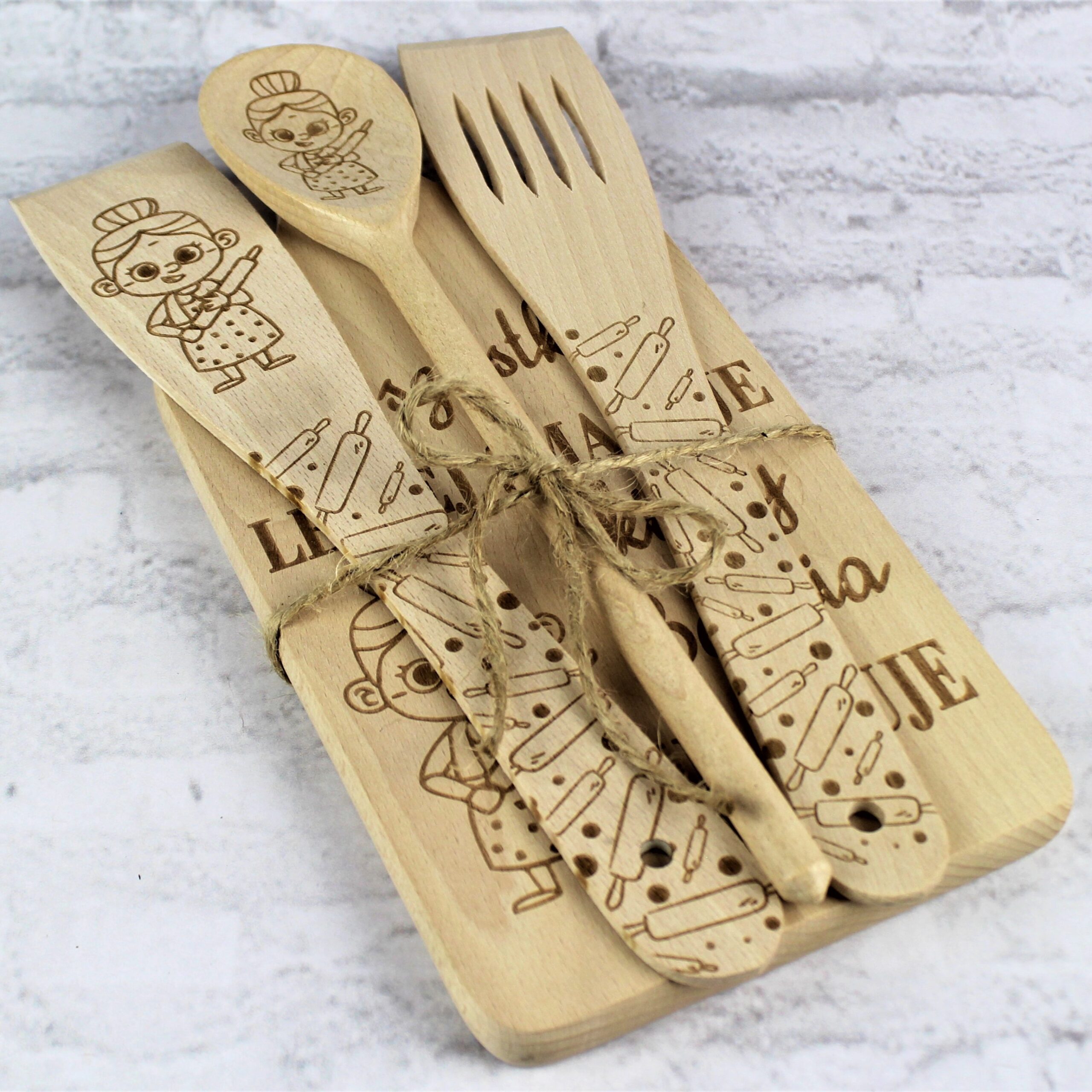 Zestaw kuchenny składający się z drewnianej deski do krojenia, łyżki, dwóch łopatek oraz sznurka jutowego ozdobionych grawerem – to praktyczny, a zarazem sentymentalny podarunek.